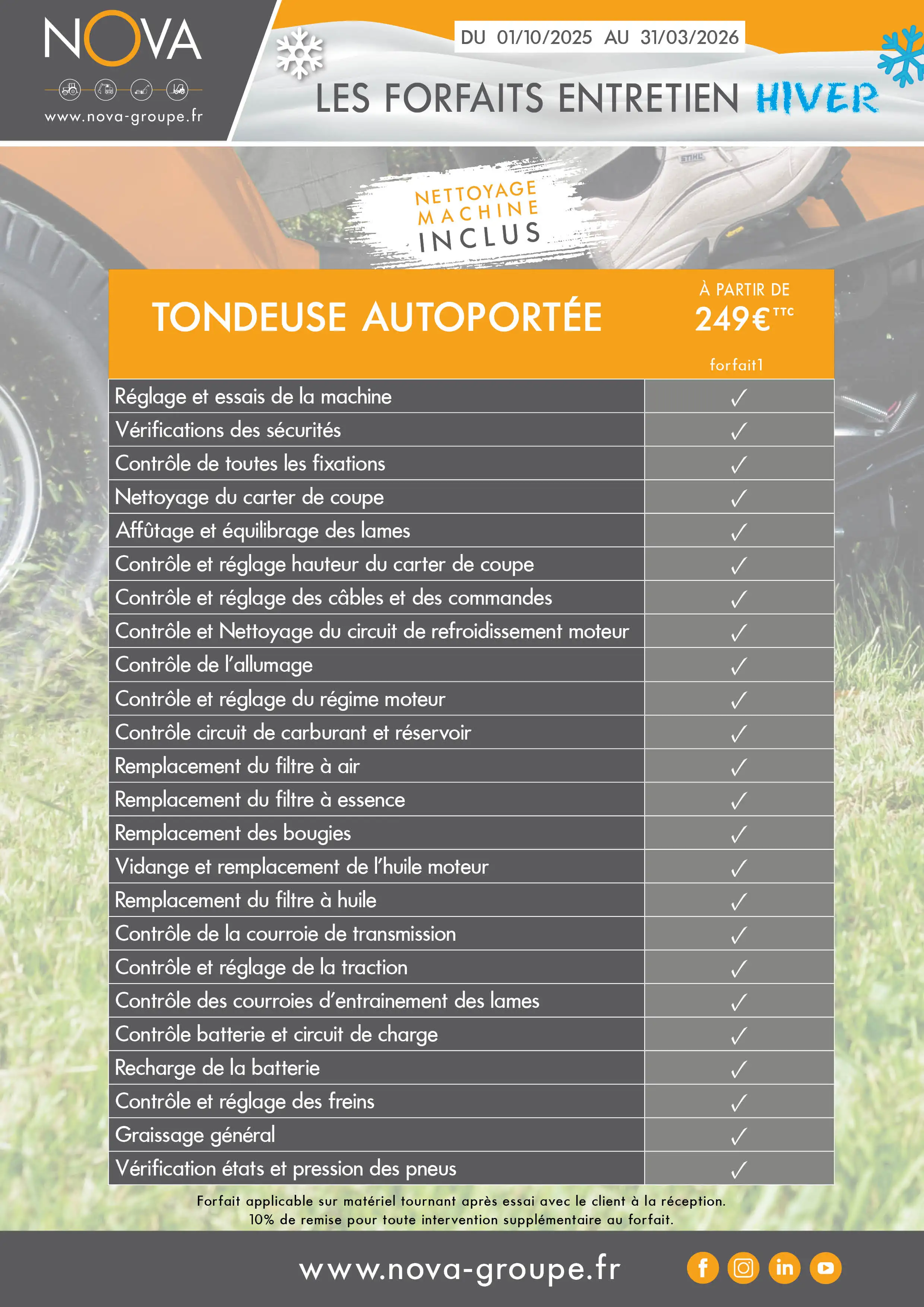 Nova vous propose une large choix de forfaits d’entretien hiver – printemps pour votre tronçonneuse, tondeuse, tracteur de tonte, débroussailleuse, motoculteur, robot de tonte et taille haies, thermique ou électrique